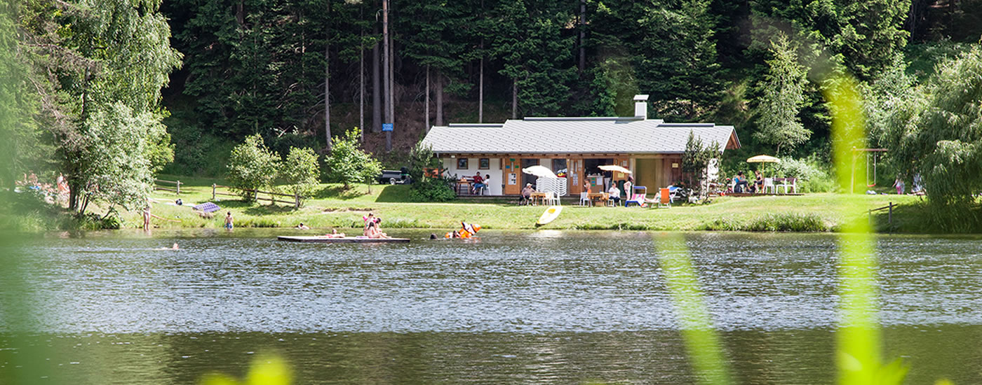 Der natürliche Badesee schimmert smaragdgrün zwischen sanften Wiesen, dunklen Wäldern und imposanten Bergmassiven.